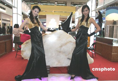 正在台北举行的优良装修材料展览上,两位着晚礼服的模特在一块非洲进口的水晶前摇曳生姿。作者:宗金柱