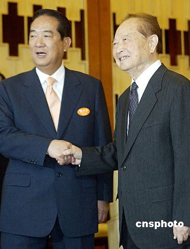 五月八日,海峡两岸关系协会会长汪道涵在上海会见了由亲民党主席宋楚瑜率领的亲民党大陆访问团。作者:廖文静