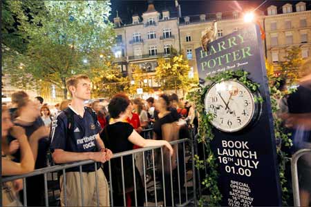 图6.全球的哈里-波特热——年7月16日瑞士的波特迷在等待《哈里-波特》系列的第六本书公开发售。哈里-波特依然吸引着全球的读者和影视爱好者。《哈里-波特》系列的第六本书《哈里波特与混血王子》在美国和英国公开发售的第一天就卖掉了900万本,创下了新书发售的新纪录。电影《哈里波特与火焰杯》在全球范围内也获得了6亿美元的票房收入。 (美联社图)