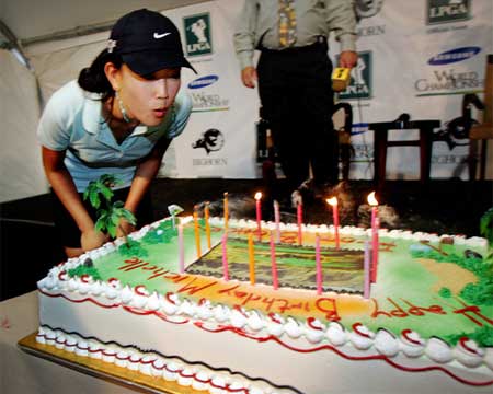 图7.高尔夫美少女——2005年10月11日,高尔夫美少女魏圣美在位于加利福尼亚的棕榈滩溪谷球场吹灭她的16岁身日蜡烛。在随后举行的三星杯女子世锦赛上,魏圣美引起了无数人的注目。但是最终年轻的她因为犯规而被取消了成绩。韩裔美国女孩魏圣美转为职业球手年收入当即达到千万美元,“美女经济”的浪潮正式涌进高尔夫球场。(美联社图)