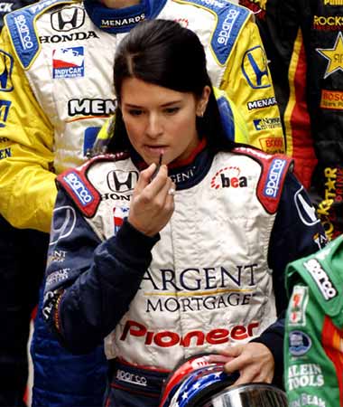 图8. 性感女车手——2005年5月23日,帕特里克结束了在纽约的印地500赛车后补妆。在美国车坛,当今最大红大紫的不是F1的大腕,也不是摩托“小飞侠”罗西以及世界拉力之王勒布,而是一位正值妙龄的印地女车手,她就是达尼卡-帕特里克,她曾为《男人帮》杂志拍摄性感广告。23岁的帕特里克在印第500汽车大赛名列第四,创造女车手最为优异的成绩。但凡有她参加的比赛,收视率飞升,人们总在关心她的成绩,至于冠军是谁得到的,似乎已经不重要了。赛车场上,也有美女经济。(美联社图)(章田/雅龙)
