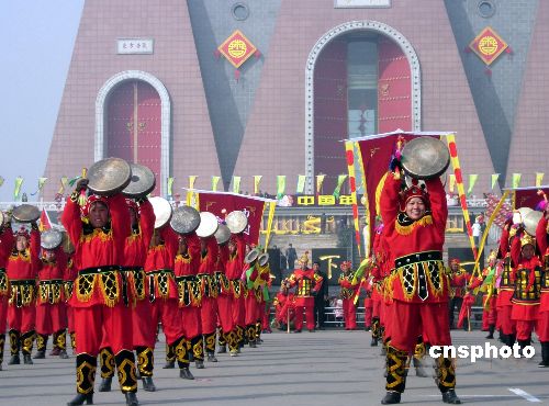 2月12日,农历正月十五日元宵节。山西临汾市在“天下第一门”华门广场前,举行盛大欢庆活动。各参演方队表演了威风锣鼓、腰鼓、花鼓、高跷等民间艺术。作者:王辉耀
