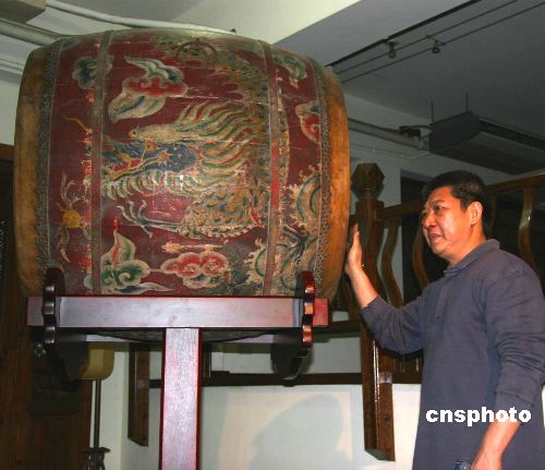 台湾最有名的制鼓作坊“响仁和”位于台北县新庄市。这里做的鼓不仅卖到全台湾,还有不少新加坡、美国等地的客户慕名来购买。图为“响仁和”主人王锡坤展示他父亲王桂枝六十四年前制作的九十公分直径庙鼓。这面鼓至今声音浑厚有力。 作者:路梅
