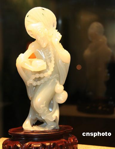 二十八日,台北梅门客栈展出玉雕《十八罗汉》,采自新疆和田的原玉在设计者和雕刻家的手中生动展现了十八罗汉惟妙惟肖的神情。图为玉雕精品济颠和尚。作者:徐长安