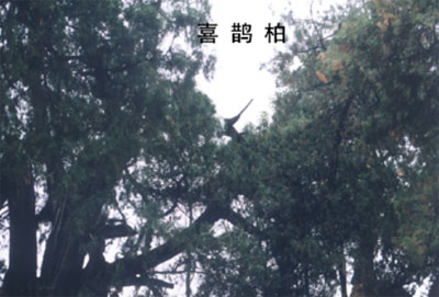 站在前殿前台上,可看到西南方向与西戏楼紧靠的那棵古柏,古柏上部树枝空间有一根干枝,干枝顶部象只喜鹊,头朝南,尾巴朝北翘起,形态生动逼真,因而为此柏取名为“喜鹊登枝柏”。