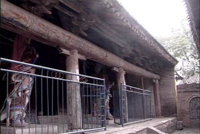 最奇特的是它的前檐通檩,长十六米,粗五十五公分,两头粗细均匀,民间传说此檩是一根蒿草长成,现在这儿用的是中节,根节和稍节人据说在其他庙宇做了大梁。蒿属本草类,当年枯,次年生。从未听说有长成树者。虽然它不可能是蒿草长成,但至今还没有人弄清这根木材的种类。专家认为:这根木材是两千年前的木材沿用至今,有可能这种树木已经绝种。