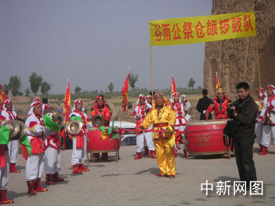 图:锣鼓队在仓颉庙前欢迎公祭典礼的贵宾