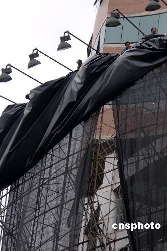 五月十七日下午,今年第一号台风“珍珠”正逼近福建,预计将在今天夜里在福建闽南一带登入。为安全考虑,福州一些工人正把市区内巨大的广告牌拆卸下来。作者:王东明