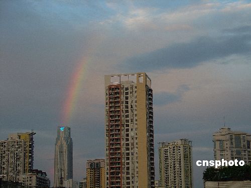 5月17日,强台风“珍珠”将于夜间在广东陆丰到饶平之间沿海地区登陆,"珍珠"不会正面袭击广州。傍晚18:50分左右,广州东边突然出现一道艳丽的彩虹,持续近15分钟,直到天暗下去彩虹才慢慢消失。今天是“世界电信日”,十分恰巧的是,美丽的彩虹正好在广州新电信大楼楼顶升起。作者:吕明