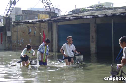 图为一些市民在水中艰难行走。作者:李瑞丹