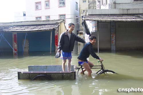 图为一些市民在水中艰难行走。作者:李瑞丹