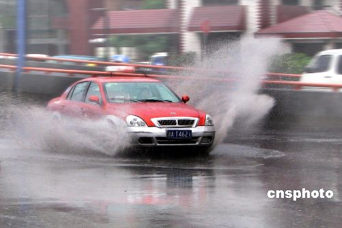 2006年5月18日,受第1号台风“珍珠”影响,浙江杭州虽然风力不大,但下了一整天大雨,不少马路来不及下水,出现汽车街头“冲浪”雨景。作者:陈加华