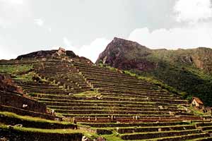 今天的游客,从印加古道来到马丘比丘。展现在眼前的几乎可以看作是人为和大自然最和睦的结合。整个山城像一只吊床,悬挂在孤峰突起的瓦纳比丘(Wayna Picchu) 和马丘比丘的两头。从它们的山脚,用巨石砌成的建筑沿着山坡顺势而下,纵向展开在两山之间(可能是开辟出来的)一片平坦的山梁上。依山而筑的山庄和耕地像阶梯一样,横向地推延到从乌鲁班巴河(Urubamba River) 切成的峡谷边缘的悬岩。它像是一个建筑师精心的设计,融汇在云雾缭绕的崇山峻岭之间。