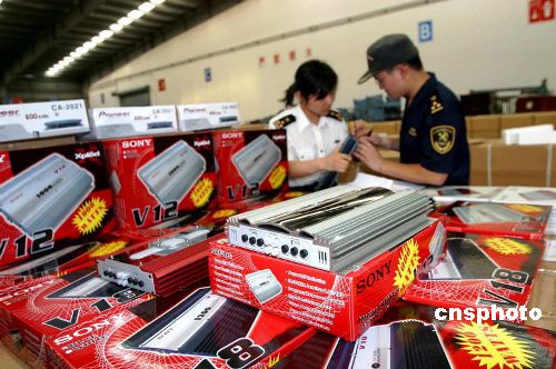 5月下旬,浙江宁波海关查获6000台侵犯“SONY”及“PIONEER”商标权车用功放器,数量分别为2100台和3900台,侵权货物价值约80万元人民币。据悉,2006年1-4月份宁波海关共查获侵权案件76起,涉案价值达1243.5万人民币。中新社发 甬关 摄