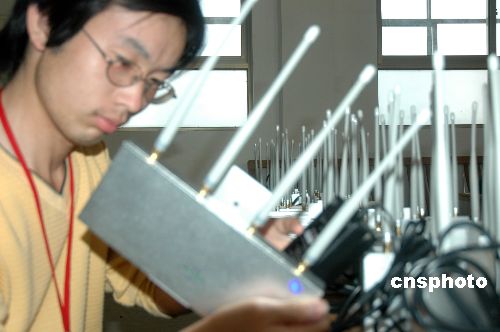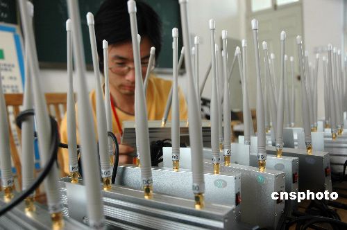 6月6日,工作人员在河南省社旗县第一高中高考考点认真检查手机屏蔽器工作情况。据悉,今年高考,河南省在去年各考点全部配备使用金属探测器的基础上,对所有考场都安装了手机屏蔽器,并对监考教师进行了岗前培训,从根本上阻断利用现代通讯工具作弊的途径,确保高考安全万无一失。中新社发 杨银鹏 摄