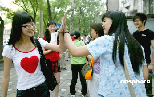 全国统一高考第一天。北京市第四中学考点外,两位考生在考前互相击掌,祝福彼此取得最好成绩。中新社发 张勤 摄