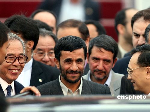六月十四日,出席上海合作组织成员国元首理事会第六次会议的各国领导人先后抵达上海。图为作为观察员国领导人出席大会的伊朗总统内贾德抵达上海浦东机场。中新社发 廖文静 摄