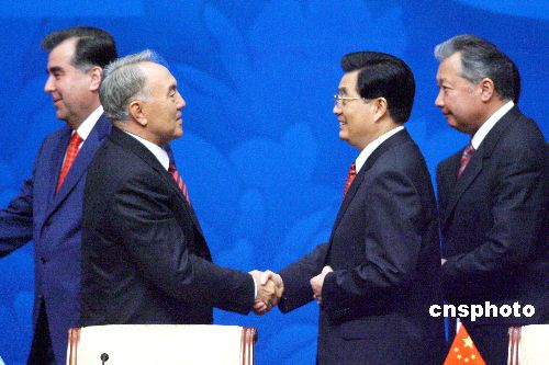 六月十五日,上海合作组织成员国元首理事会第六次会议在上海举行。会后上合组织成员国领导人出席了签字仪式。图为塔吉克斯坦总统拉赫莫诺夫、哈萨克斯坦总统扎尔巴耶夫、中国国家主席胡锦涛、吉尔吉斯斯坦总统巴基耶夫(左至右)在会后握手致意。中新社发 廖文静 摄