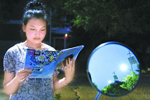 7月25日晚,一名居民在呼和浩特市学府花园社区的“风光互补”路灯下阅读。7月24日,呼和浩特市学府花园社区投资13万元,在广场安装了4套“风光互补”路灯,利用风能和太阳能为小区照明,此举每年可节约用电14000多度。新华社发