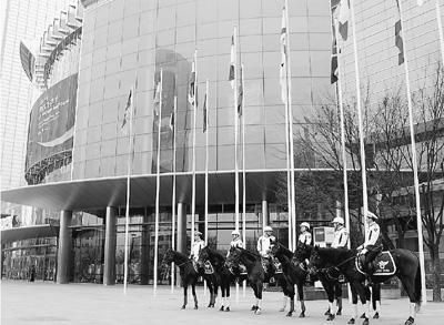 韩国骑警在核安全峰会主会场外执勤。