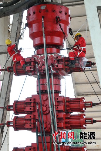 元坝气田的石油工人在安装井口。 摄影 王珊珊