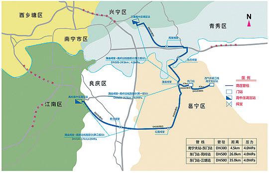 今年10月份,主体工程将建成投产。其中蒲庙站负责向南宁市东部新城区供气、高岭站负责向南北片区供气、三塘站负责向东北片区供气,工程完成将保证南宁市的天然气需求。输配气能力约4.8亿标准立方米/年。