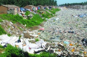 垃圾坑引来了很多收废品的人,炙热的阳光下,他们在垃圾坑里费力地翻捡着。这些人还在坑四周搭建了一圈低矮的窝棚和砖房,房前屋后码放着他们收集到的废品,等待装车运走。