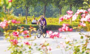 从育才街与槐安路交叉口一路向西行驶,越向西行,各种花、草、树木越多,片林越多,骑山地车与电动车的游客越多……枫树、金叶榆、梧桐树、银杏、柿树、杨树、月季等层林尽染,大片的树林、农田,让人置身于田园风光。