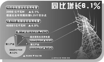 国家能源局今天发布的数据显示,10月份全社会用电量3998亿千瓦时,同比增长6.1%,增速比去年同期回落5.25个百分点,但下滑态势有所缓解。1月至10月,全国全社会用电量40881亿千瓦时,同比增长4.9%。