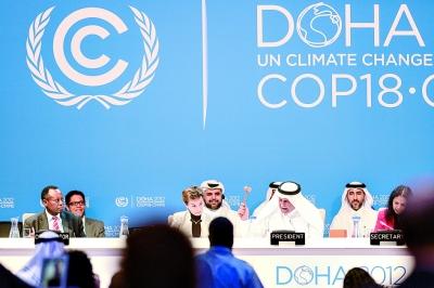 在经历一天的超时谈判后,阿卜杜拉·阿提亚当晚宣布,大会通过包括《京都议定书》(《议定书》)修正案在内的一揽子决议。 (记者 李木子 )