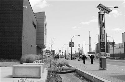 右上图:在芝加哥瑟马克路上的一所中学前,由风力—日光组合发电机给路灯供电,生物洼地将雨水和污水分流。