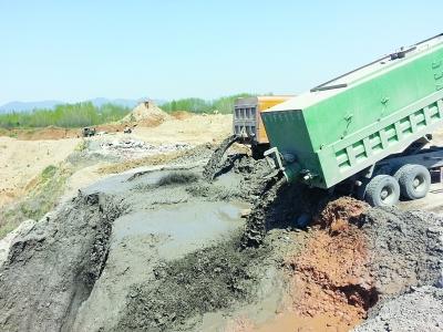 运输泥浆的槽罐车将泥浆倒入私设的土场内。 裴睿 摄
