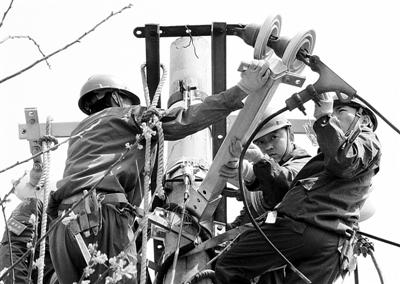 图为北京电力公司的技术人员在电线杆上安装新型电线杆防鸟害横架。新华社记者 李欣摄