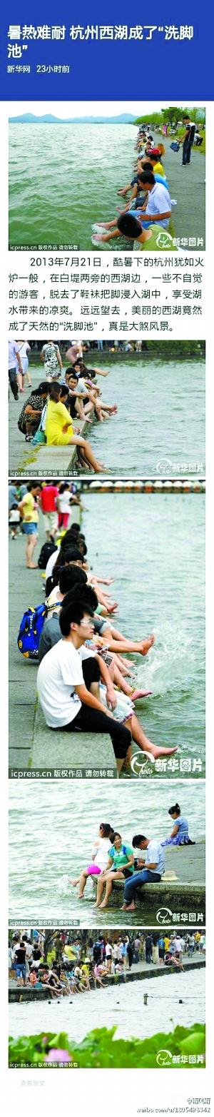 7月21日,在白堤两旁的西湖边,一些游客脱去了鞋袜把脚浸入湖中,享受湖水带来的凉爽。远远望去,美丽的西湖竟然成了天然的“洗脚池”。