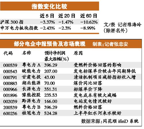 而近期受业绩超预期的支撑,电力股近期在二级市场的股价也出现反弹回升态势。7月以来,50只电力股实现上涨,但涨幅仍然处于起步阶段。昨天,皖能电力涨,华能国际、粤电力A等均小幅上涨。但近5日、近20日和近60日,沪深300指的变化分别为-3.37%、 -1.47%和-10.62%,而申万电力板块指数正在追赶这一指数,同期其变化分别为-2.43%、-2.3%和-8.99%。
