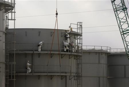 日本东京电力公司的工人正穿着防护服和面罩建设储水罐。(自路透社)