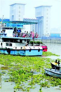 4日,大量漂浮的白色垃圾与水葫芦,随汛期洪水卷进宜昌市长江葛洲坝上游库区黄柏河水域。为了防止繁殖能力超强的水葫芦在葛洲坝库区蔓延,当地每天组织专人对江面漂来的水葫芦进行打捞,净化水面。(记者刘曙松 摄)