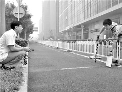 昨日,踏勘人员在CBD国际大厦附近测量路宽,激光测距仪替代了过去的尺子量路宽。新京报记者 郭超 摄