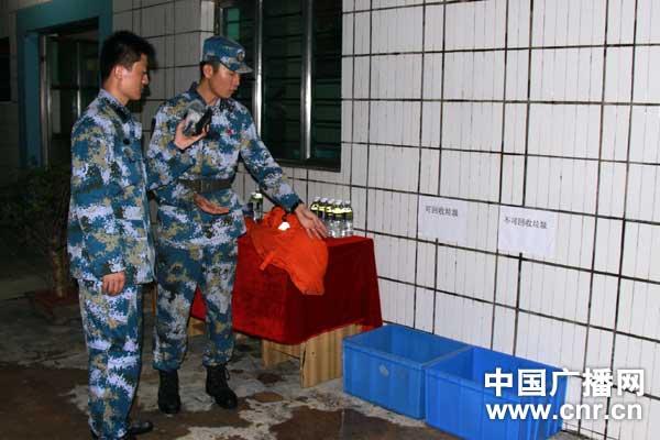 在南沙各礁堡的墙壁上,经常可以看到这样的宣传语:礁堡是我家 环保靠大家。白色墙壁上,鲜红油漆刷写的大字,在蓝天碧海的映衬下,非常醒目。宣传语的中间,还有官兵们自己设计的环保图案。在礁堡的角落,守礁官兵们自制的蓝色垃圾筐全部都是两两并排摆放。两个垃圾筐的白色标签上分别写着“可回收垃圾”和“不可回收垃圾”。东门礁礁长尹文玖介绍说,对南沙守礁官兵而言,垃圾分类早就成为一种生活习惯。