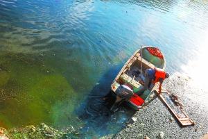 近日在通惠河大望桥段河面上,一位水务工作者驾驶作业船正在清理垃圾。据相关负责人介绍,他们每天清理几十吨垃圾,这些垃圾大部分是从排污管道流进河里的,另外一部分是人们丢弃到河里的。本报特约摄影 孙山