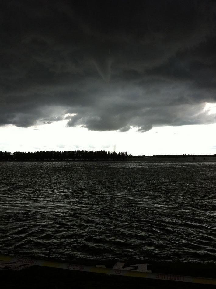 8月19日,黑龙江大庆,松花江大庆-肇源段江面上出现了小型龙卷风,形成了“龙吸水”现象,随后附近降下最大约有鸽子蛋大小的冰雹,持续大约十分钟。大庆油田报朱睿然摄。
