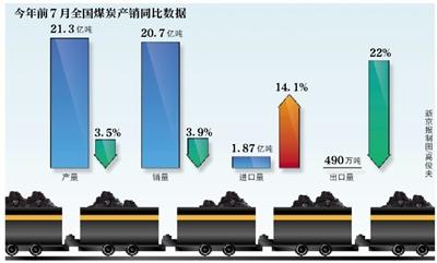 据新华社电 中国煤炭工业协会19日通报,今年前7个月全国煤炭产量21.3亿吨,同比减少7800万吨,下降3.5%;全国煤炭销量20.7亿吨,同比减少8400万吨,下降3.9%。此外,自2012年二季度开始煤炭采选业固定资产投资增速下降,今年前7个月煤炭投资2589亿元,同比下降1.6%,降幅收窄。在进出口方面,前7个月,全国累计进口煤炭1.87亿吨,同比增长14.1%;累计出口490万吨,同比下降22%。