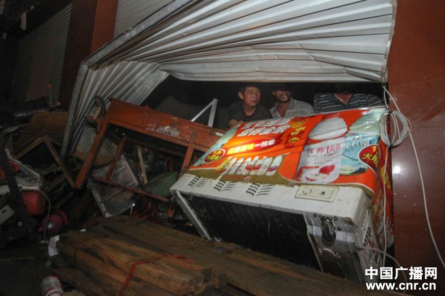金田镇一户人家的卷闸门被洪水冲毁,冰柜卡在其中(中广网记者 张垒 摄)
