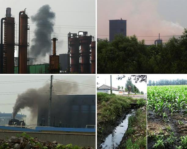 江泉工业园内,烨华焦化上空烟尘腾起,弥漫如火烧云。附近玉米田里,黑色污水随渠流转,溢向农田。
