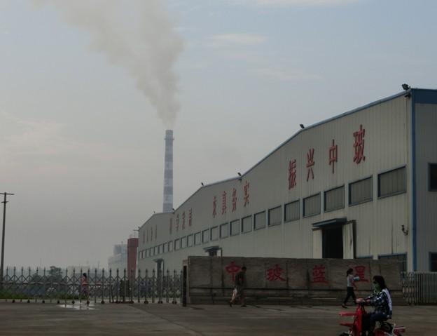 循环经济示范区内,中波蓝星烟囱黄烟袅娜,路过行人掩口罩鼻。
