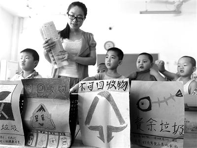 在安徽合肥市笔架山街道一所幼儿园,老师在教小朋友如何进行垃圾分类。