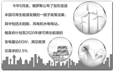 今年5月底,俄罗斯公布了旨在促进本国可再生能源发展的一揽子政策法案,其中包括太阳能、风电和水电电站。俄政府计划至2020年使可再生能源的发电量达6GW,满足能源总需求的2.5%。