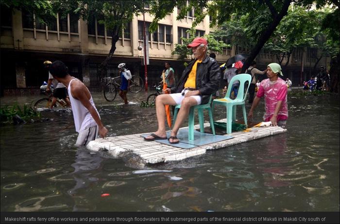 菲律宾国家减灾委员会主席罗沙里欧(Eduardo del Rosario)称,首都地区洪水覆盖范围现已降低到20%左右,主要集中在大马尼拉地区马利吉拉(Marikina)和帕拉那克(Paranaque)等市,部分地区洪水仍然齐腰甚至齐颈深,三轮车和临时制作的简易竹筏成为运送办公室人员和行人出行的交通工具。