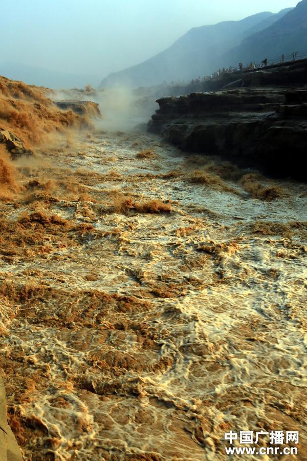 在陕西省延安市宜川县壶口乡拍摄的汹涌澎湃的黄河之水和壮观的瀑布(2013年8月11日早晨摄)。(中广网发 邱海鹰 摄)