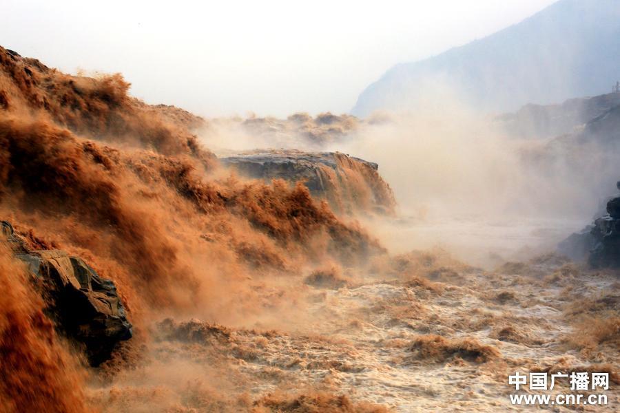 在陕西省延安市宜川县壶口乡拍摄的汹涌澎湃的黄河之水和壮观的瀑布(2013年8月11日早晨摄)。(中广网发 邱海鹰 摄)